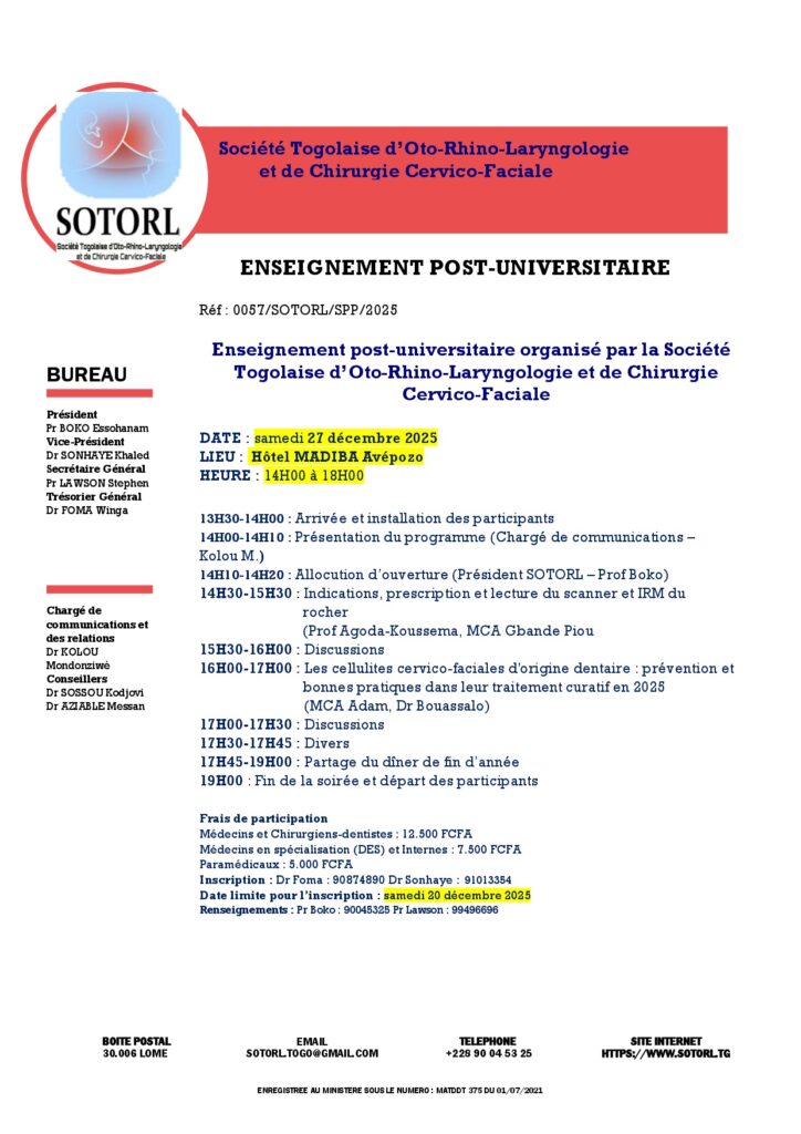 La Société Togolaise d’Oto-Rhino-Laryngologie et de Chirurgie Cervico-Faciale (STOL-CCF) a le plaisir de vous convier à sa prochaine session d’enseignement post-universitaire dédiée à l’actualisation des connaissances et au partage d’expériences cliniques et chirurgicales dans notre spécialité.